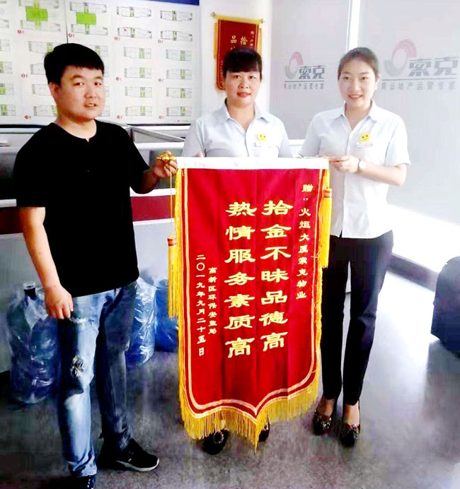 项目物业人员捡到环保安监局局长遗失的手机并积极寻找失主,第一时间归还,客户送锦旗感谢