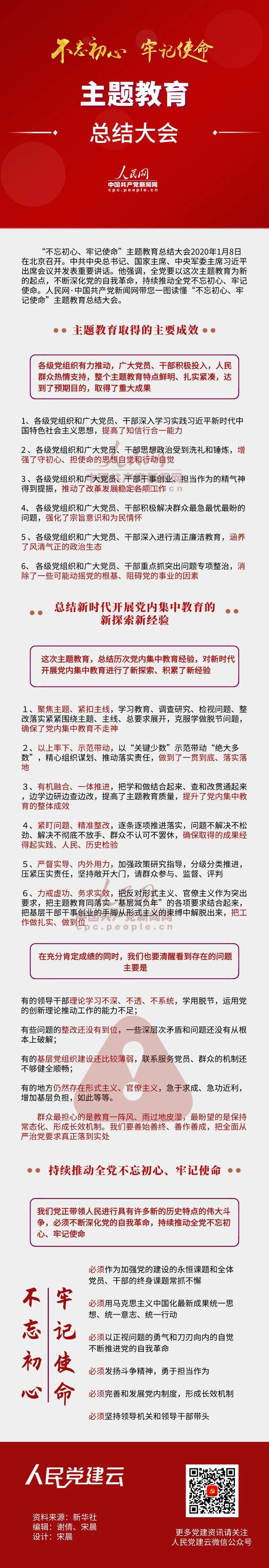 “不忘初心、牢记使命”主题教育总结大会8日在北京召开。中共中央总书记、国家主席、中央军委主席习近平出席会议并发表重要讲话。他强调,我们党要始终得到人民拥护和支持,书写中华民族千秋伟业,必须始终牢记初心和使命,坚决清除一切弱化党的先进性、损害党的纯洁性的因素,坚决割除一切滋生在党的肌体上的毒瘤,坚决防范一切违背初心和使命、动摇党的根基的危险。全党要以这次主题教育为新的起点,不断深化党的自我革命,持续推动全党不忘初心、牢记使命。