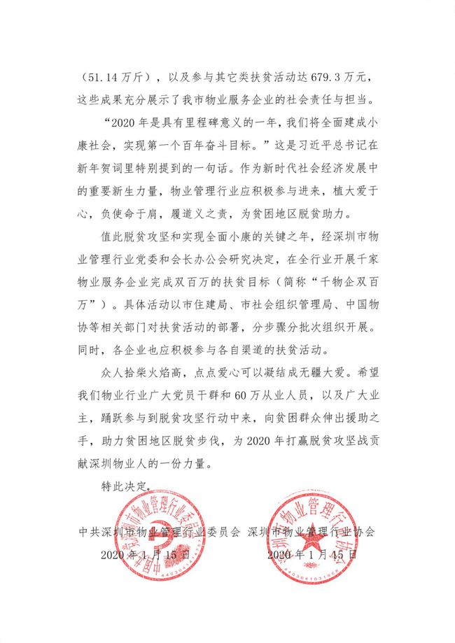 关于组织深圳市物业服务企业继续参与脱贫攻坚行动暨开展“千物企双百万”扶贫活动的决定