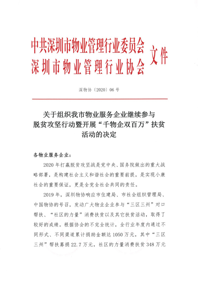 关于组织深圳市物业服务企业继续参与脱贫攻坚行动暨开展“千物企双百万”扶贫活动的决定
