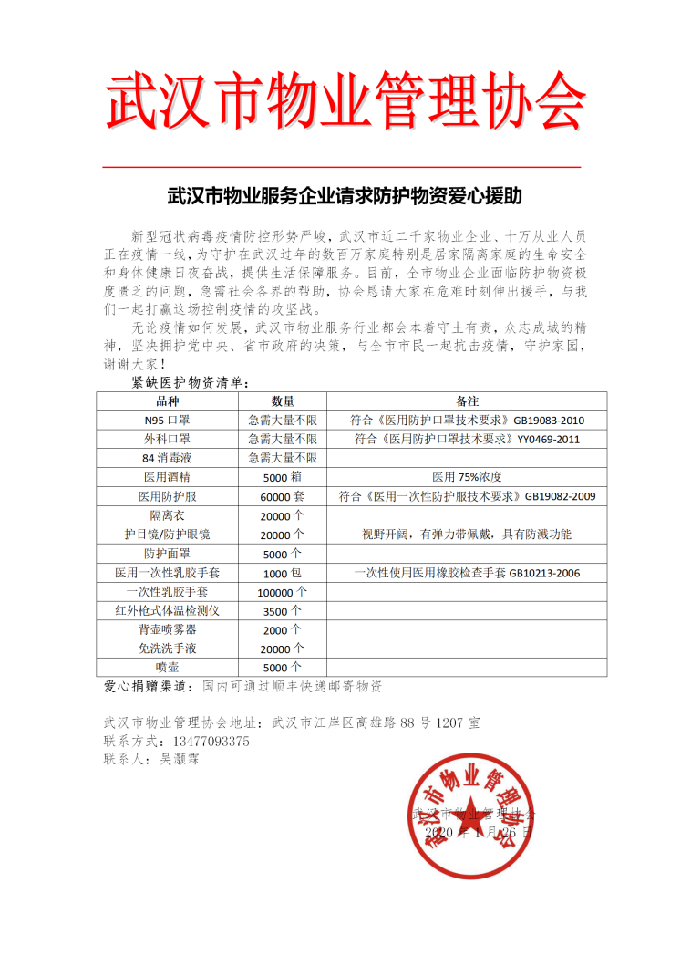 武汉市物业管理协会特别提醒:无需汇款,请求物资支援。