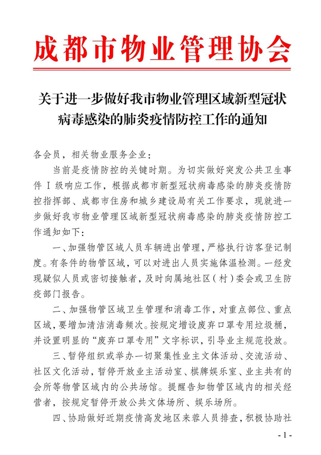 成都市物协:关于进一步做好物业管理区域新型冠状病毒感染的肺炎疫情防控工作的通知
