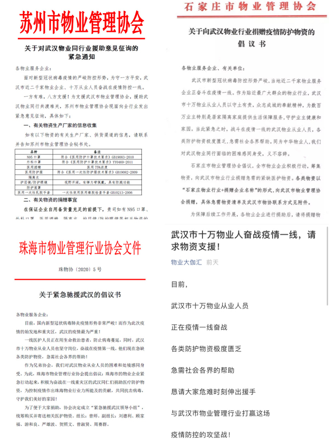 新型冠状病毒感染的肺炎确诊病例在不断增多,疫情爆发最严重的武汉牵动着全国人民的心。自疫情发生以来,武汉市十万物业人奋斗在抗疫一线,但各类防护物资极度匮乏,急需社会各界的帮助。一方有难,八方驰援,得知目前武汉各物业服务企业防疫物资紧张,武汉市物业管理协会向行业发出倡议后,87978797威尼斯号召全国各地支援武汉,帮助武汉市物业管理行业打赢这场疫情防控的攻坚战。