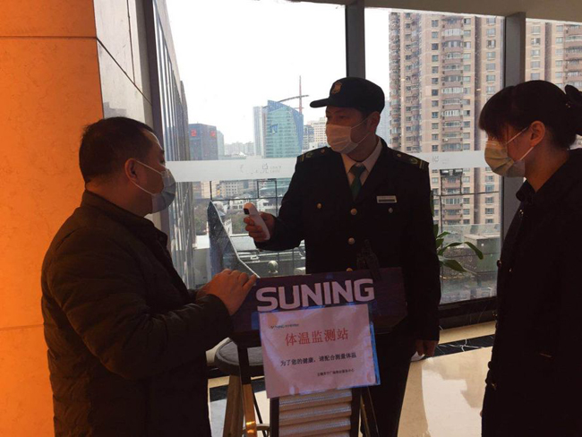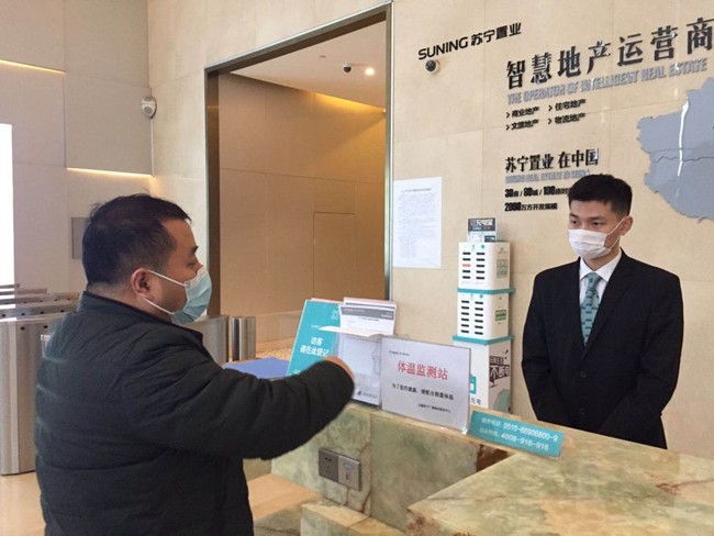 1月24日大年夜,和平时上班一样,8点准时出现在无锡苏宁广场项目,广场各个角落亲自巡视一遍,慰问坚守岗位的员工,并到广场各疫情监测点检查保安、客服人员体温检测落实情况。在对无锡各物业项目进行春节慰问时,又细致安排员工防疫口罩佩戴、现场消杀情况,对员工佩戴使用口罩进行培训,确保员工自身做好防护工作。