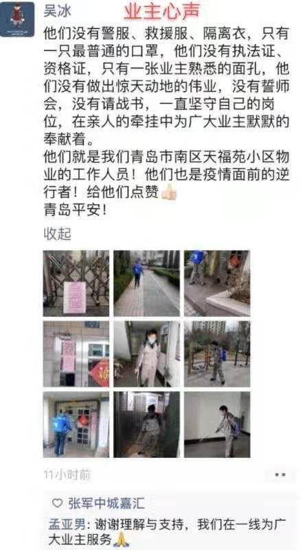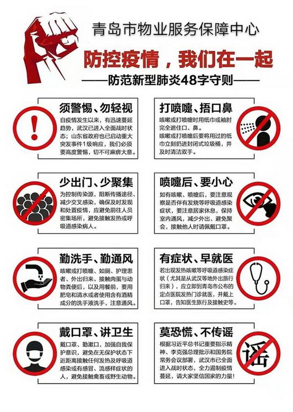 谣言本身比病毒更可怕,疫情发生之初,因消息的不对称性及部分人利用互联网推波助澜,造成一定社会恐慌,物业管理部门着眼大局,大年三十晚上连夜联合卫生部门制作防范新型肺炎48字守则,简单、通俗、易懂在全辖物业管理区域张贴,利用传统广播、公告栏及现代微信公众号、APP等全媒体向业主和物业使用人推送,正面发声,及时印发《青岛市住房和城乡建设局<关于进一步做好新型冠状病毒感染的肺炎疫情防控工作的紧急通知>》引领舆论及时起到止谣辟谣作用,保证了物业管理区域有序稳定。