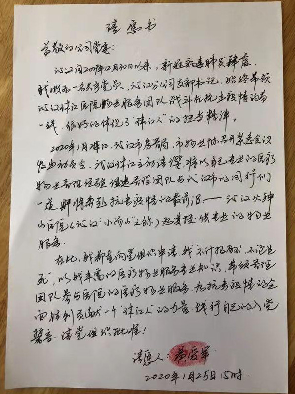 我自愿申请加入到武汉火神山医院物业管理管理团队,不计报酬,无论生死!这是火神山医院首批进驻的武汉珠江物管人员的誓言。