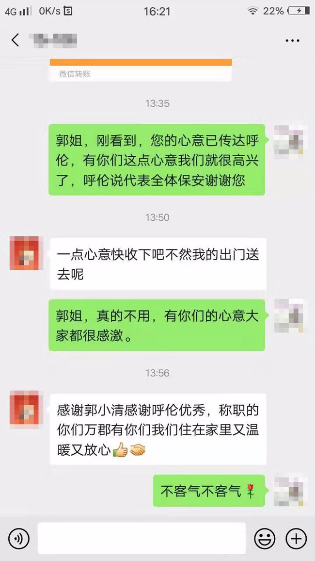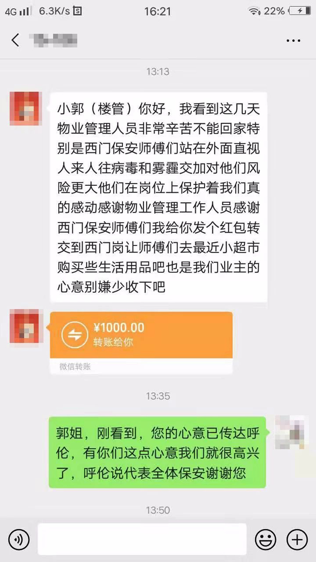 “现在我们24小时备战,今天(1月30日)中午,有业主在群里对我们的防控疫情工作进行点赞,一会儿,业主郭爱玲阿姨给我打电话,问我们保安吃饭问题怎么解决,她说你们真辛苦呀,给你们捐上1000块钱,买点日用品,我说不用,您的心意我们领了,但钱不能拿,你如果想感谢我们,可以找楼管,送面锦旗,这个我们能接受,但钱不能接受,郭阿姨就联系了郭楼管,给郭楼管发了1000元红包,但郭楼管没领。”保安主管呼伦回忆。