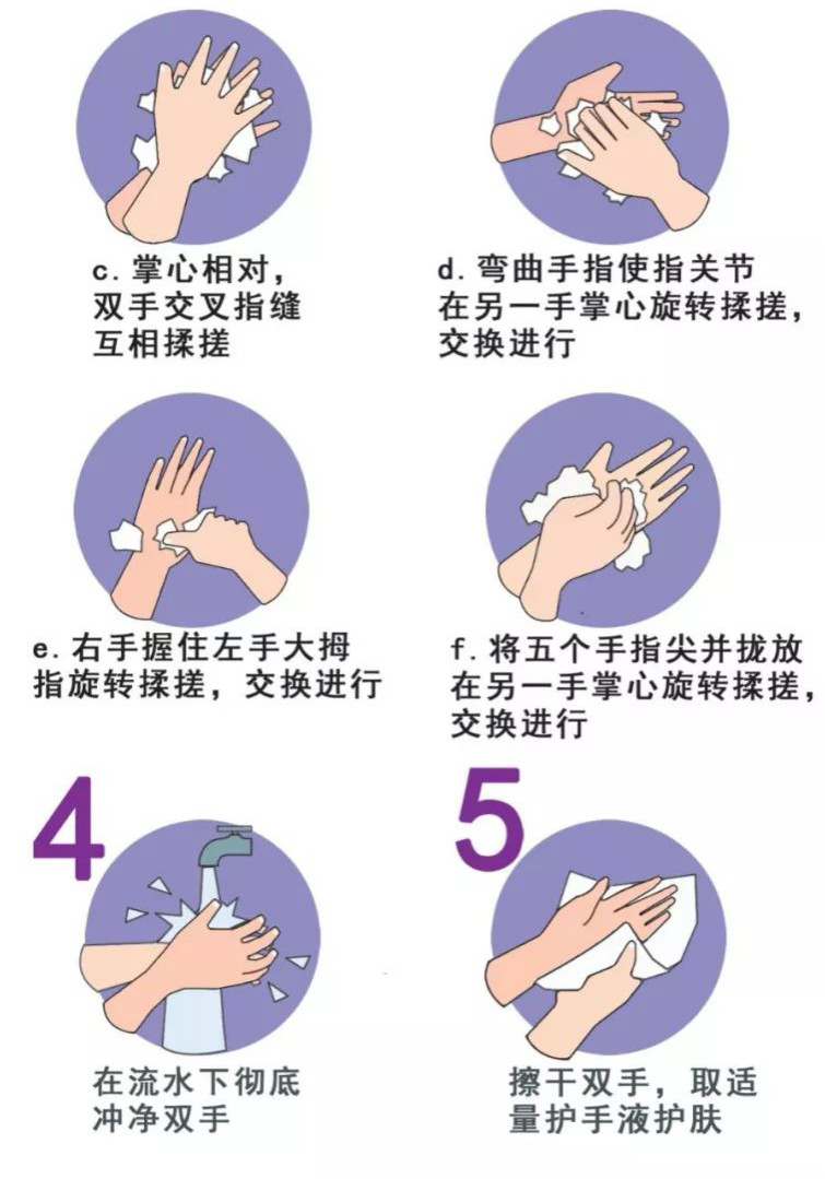 正确的洗手方法是个人良好卫生习惯重要内容之一,能有效的防止新型冠状病毒的传播。在与患者接触后,触摸眼、口、鼻前,打喷嚏或咳嗽后,如厕后,带口罩前及摘口罩后,接触公共设施如扶手、门柄、电梯按钮、公共电话后、从外面回家后等均应及时洗手。