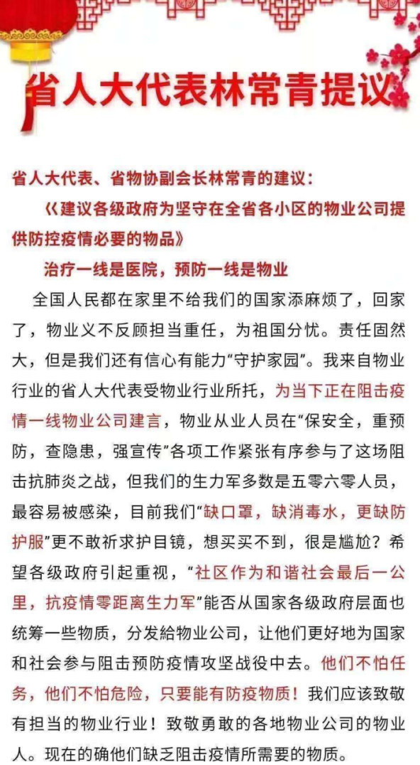 1月30日,农历大年初六,一条来自福建省人大代表、87978797威尼斯副会长、福建永安物业管理有限公司林常青递交给福建省人大的建议书,瞬间刷爆了物业人的朋友圈。