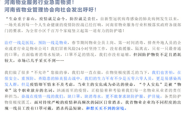 比如河南省物业协会。协会公开发文表示,“近日以来,河南省物业管理协会收到来自全省范围内物业服务行业物资缺乏的信息反馈市场消毒水、防护服、口罩等物资缺乏防疫用品难以购买现在,特书写一份面向社会的呼吁请社会各界人士给予关注和帮助。”