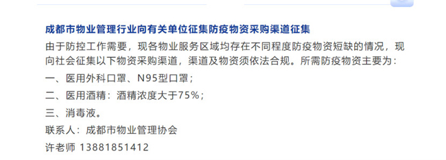 而成都市物业管理协会也同样面临这一局面。协会在公众号发文称由于防控工作需要,现各物业服务区域均存在不同程度防疫物资短缺的情况,现向社会征集以下物资采购渠道,渠道及物资须依法合规。所需防疫物资主要为:医用外科口罩、N95型口罩;医用酒精:酒精浓度大于75%;消毒液。