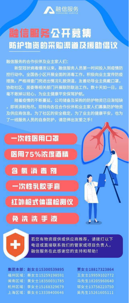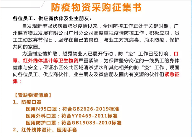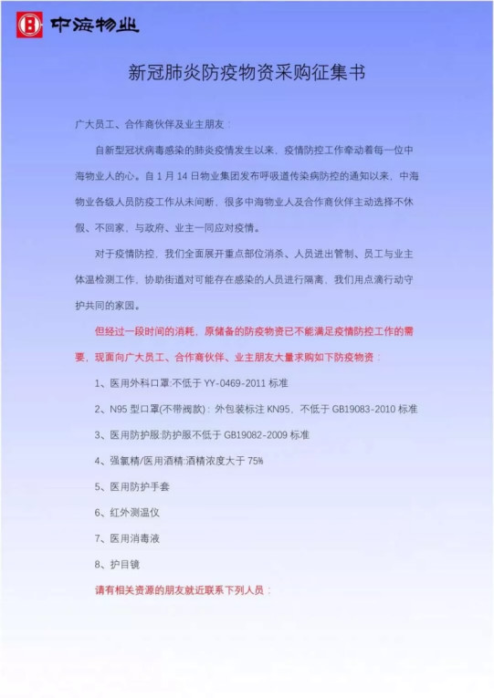 中海物业近期也同样在对外征集防疫物资。中海物业指出,公司花费大量人力验证渠道信息,希望能通过安全途径购买可靠物资,把隔离措施做到极致,来缓解一线即将面临的大面积短缺。