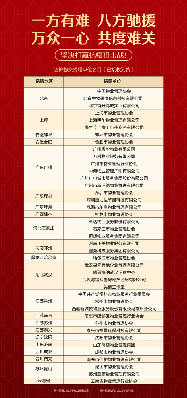 自武汉“封城”后,全国各地物业管理行业、社会各界纷纷伸出援助之手,为武汉的物业同仁们送上口罩、消毒液、喷壶、药品等防疫物质,今天又有新的防疫物资,从全国各地源源不断地发往武汉了。截至2020年2月1日数据统计结果,武汉市物业管理协会累积接收到22个地区捐赠的防护物资。