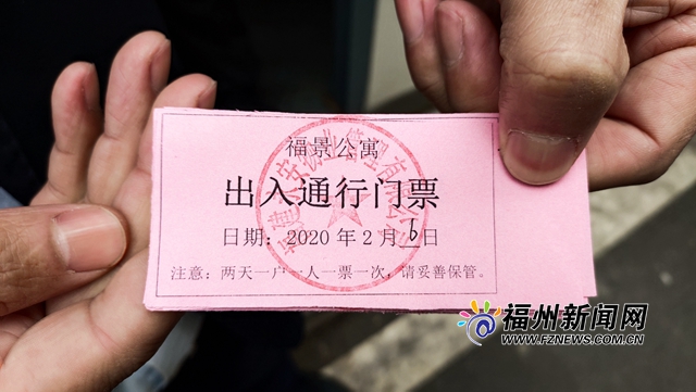 “您好,请检测一下体温!另外,这是我们今天印发的出入通行门票,两天限一户一人一票一次,请您妥善保管。”6日11时许,在福州市鼓楼区福景公寓门口岗亭处,物业经理刘志华逐一为回来的业主查体温、派发通行票。