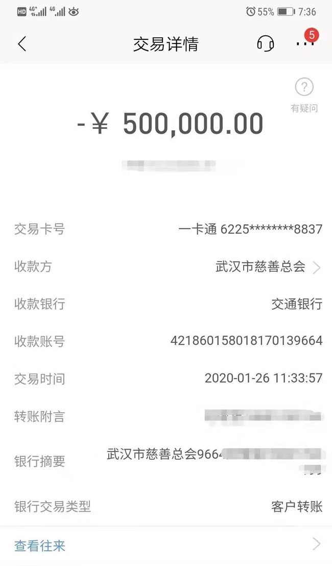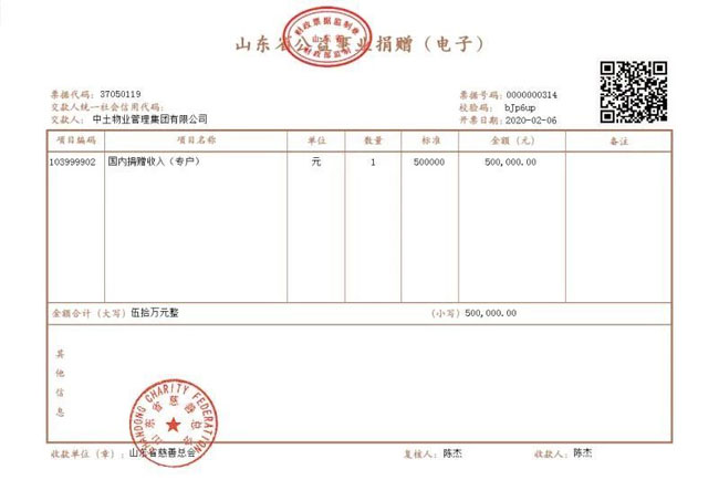 1月26日,疫情来临伊始,中土物业集团董事长以个人名义紧急向武汉市慈善总会捐款50万元,该款项由武汉市新型肺炎防控指挥部专项用于支持抗击新型冠状病毒感染肺炎疫情防控工作。
