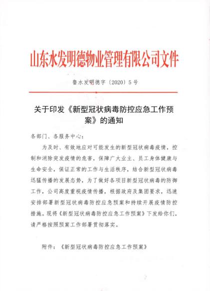 水发明德物业历来重视在管各项目的日常安全管理和卫生保洁工作,2019年下发各专业的工作手册并培训到位落地执行。在这次疫情初起之时,水发明德物业就迅速反应,成立防疫领导和工作小组,下发应急预案,带动全员立即行动起来。