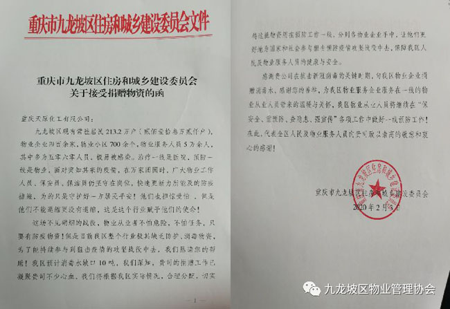 面对着防疫物资短缺的严峻考验,九龙坡区物业管理协会在区住建委的支持下,快速响应,采取行动,经与天原化工厂沟通联系,顺利使捐赠物资运达重庆主城,为我区物业小区的防疫工作构筑一道保障线。