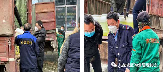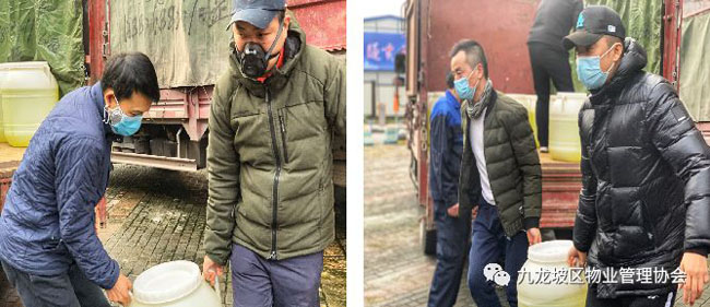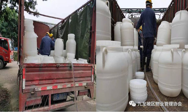 生命重于泰山,疫情就是命令,治疗一线是医疗救治,预防一线是物业服务。物业服务企业不怕危险,勇于承担预防任务,战斗在物业区域预防一线。但整个行业防疫物资极度匮乏,四处告急。2020年2月2日,九龙坡区物业管理协会在区住建委的支持和帮助下,为我区物业企业争取了10吨天原化工捐赠的“天原消毒液”,解决了消毒物资匮乏的燃眉之急。