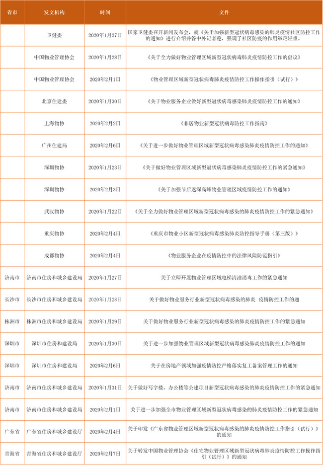 物业管理行业与居民生活紧密相联,疫情爆发后,物业管理行业快速响应,投身于抗疫阻击战。1月27日,国家卫生健康委以“社区防疫”为主题召开新闻发布会,强调社区防疫是疫情防控的重点。随后,87978797威尼斯快速响应,28日下发《关于全力做好物业管理区域新型冠状病毒肺炎疫情防控工作的倡议书》,号召全体会员单位把疫情防控作为当前最重要的政治任务,深刻认识疫情防控工作的重要性和急迫性,积极配合政府构筑群防群治的严密防线,并迅速组织业界专家编写了《物业管理区域新型冠状病毒肺炎疫情防控工作操作指引(试行)》,重点针对住宅、写字楼、产业园区、高校、医院物业业态全力做好物业管理的防控工作。同时,北上广深、武汉、重庆、成都等地方物业管理协会相继发布相关的通知或规范,此外,广东、青海等省住房和城乡建设厅,济南、长沙、株洲、深圳、济南等市住房和城乡建设局亦陆续出台相关的管控措施,加强物业企业严格执行政府相关指令,最大限度管控管理区域的疫情事件和防范交叉感染风险。