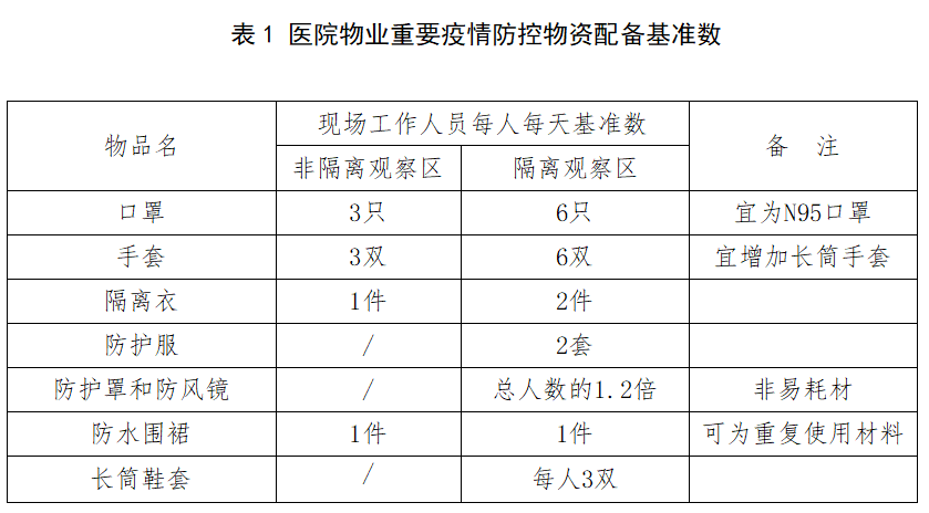1.防控物资方面,应配备消毒物品(包括84消毒液、其他含氯消毒剂、75%酒精、医用消毒湿巾、免洗消毒洗手液)、测温设备、消毒器具(包括喷壶、紫外线消毒灯)、防护器具(包括一次性医用外科口罩、N95口罩、隔离衣、防护服、护目镜、防护罩、防护鞋套、医院乳胶手套等)和保洁耗材(如医疗废物垃圾袋、消毒抹布、拖把等)。主要防护物资数量应至少保证2~5天的用量,具体可参考表1核算。