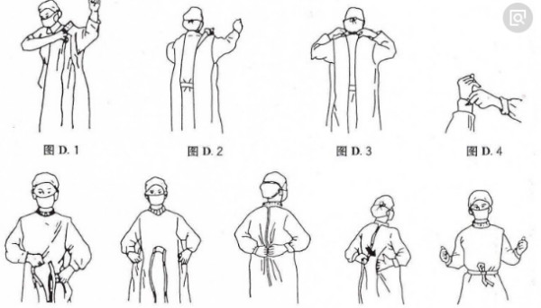 6.双手转换逐渐从袖管中退出,脱下隔离衣,如图D.15;