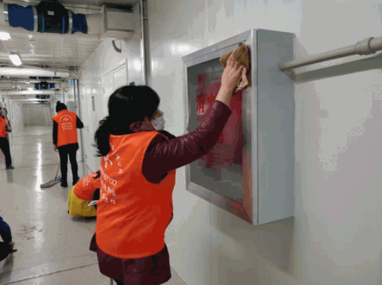 来自中建三局、医管家、珠江、万科、惠之美、贵阁和金地和重庆东原物业8家物业企业率先派员上火线第一批64人的物业管理服务队伍在2月1日赴火神山医院现场,2月2日凌晨4点,100多人的保洁队伍,火神山医院一病区病房开始,对医院内部进行开荒保洁。经过12个多小时的通宵奋战,火神山医院从办公区、生活区及部分具备条件的新建病房区成功完成了首次大规模保洁清理工作。为火神山医院的医护人员及患者提供了干净舒适整洁的环境。