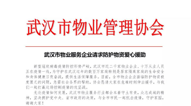 最后还有就是希望政府能够提给广大物业服务企业采购防疫物资的相关渠道,因为就武汉来说,我们不能让正奋战在一线的广大物业员工因个人防护用品采购不畅而导致他们处于暴露在病毒中的风险。