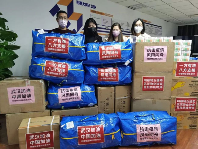 截至2020年2月5日,武汉市物业管理协会收到了25个地区、16个物业协会,共超53个单位的防疫捐赠物资。包括:消毒水、消毒片、普通口罩、N95口罩、橡胶手套、喷壶、护目镜、防护服、洗手液等防疫工具 、红外测温仪、药品等物资。
