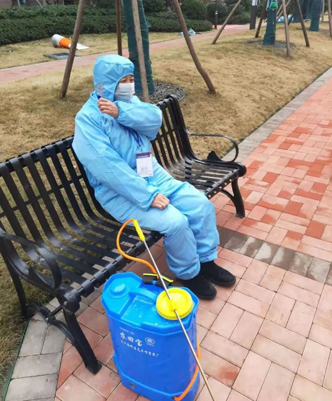 2月8号,已经连续工作11天的李亚伟背着药桶对园区进行当日的第二遍消杀时,腰痛病发作,一时疼得直不起来。她靠在园区休闲椅上稍作休息后便又再次投入工作。