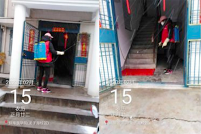 ▲蚌埠医学院项目在风雪中进行防疫消杀工作