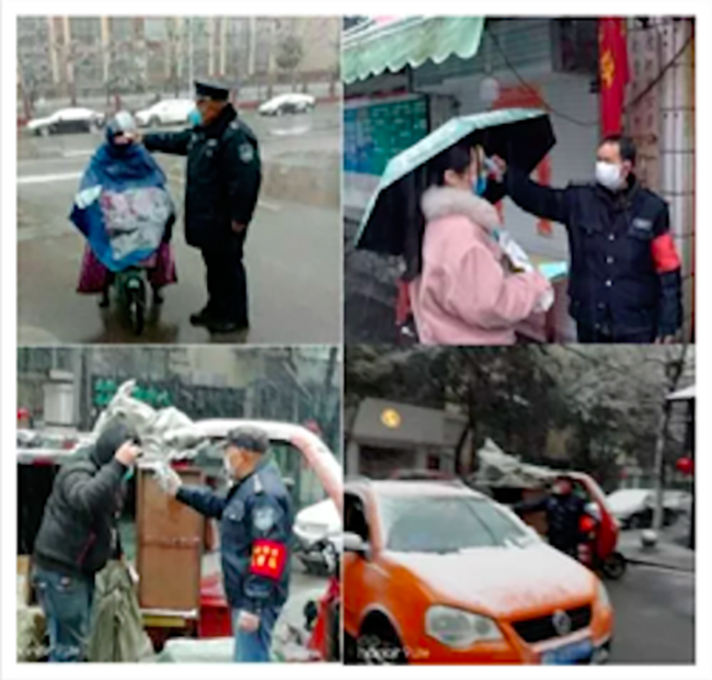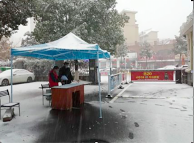 上下班高峰期时,为了方便行动和登记,他们脱下雨衣,有时甚至顾不上打上雨伞,快速的奔跑在大雪中,只为了能够快一点为业主测量登记体温,让业主在风雪中少等一会,少受一点寒冷,能够再早一点回到温暖的家中。