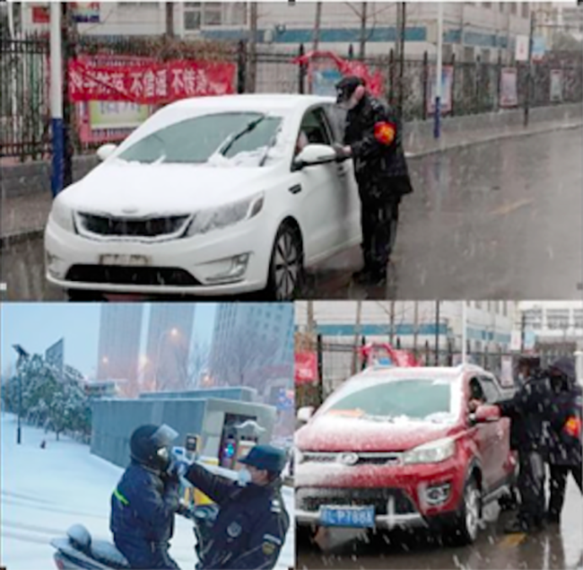 ▲风雪再大,也要坚持,宿州学院、怀远县人民法院项目保安对驶入车辆进行登记,对车内人员进行体温检测
