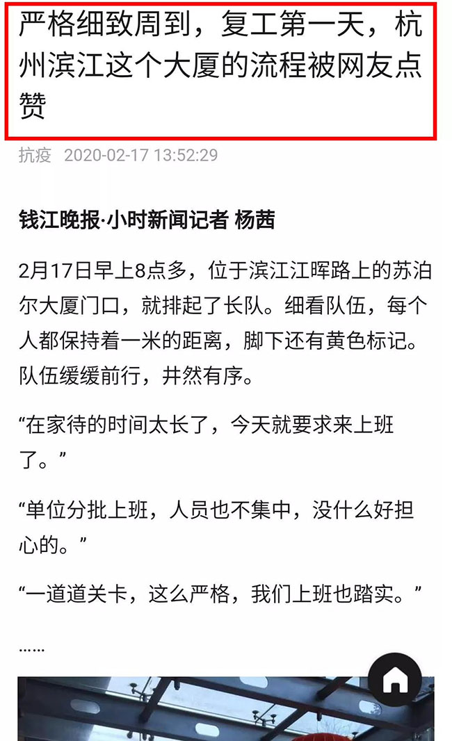 “一道道关卡,这么严格,我们上班也踏实。”昨天,一篇《严格细致周到,复工第一天,杭州滨江这个大厦的流程被网友点赞》的报道经钱江晚报发布,一时引起热议。
