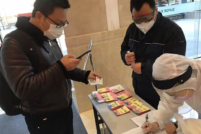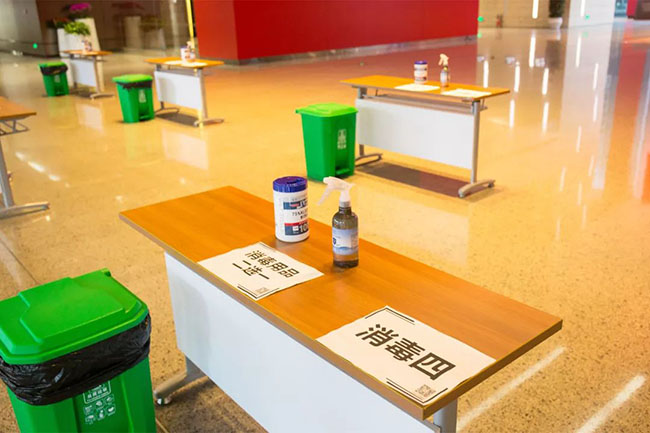 经过连续多天的夙夜奋战,物业团队已在整个园区布置了16个测温点,5个复测点,10个自助消毒点,2台远红外侧温仪。以标准化的流水线作业,平均三十秒过完流程,每三秒两人。