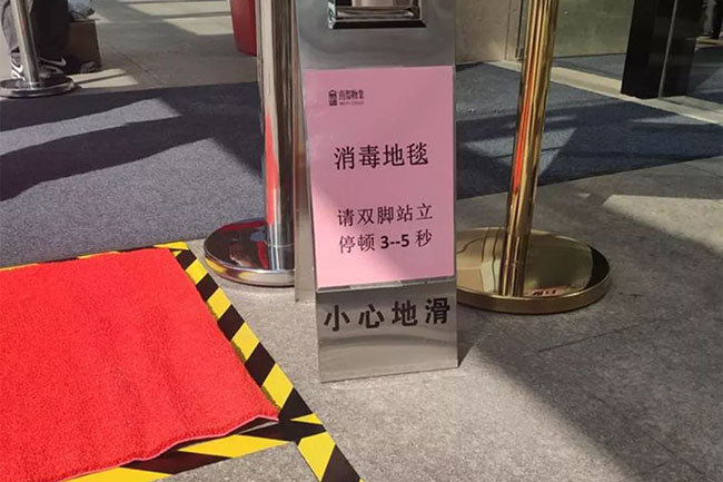 为了最大程度隔绝病毒,让消毒从鞋底做起,严格防护外来细菌,物业团队特别在大厦门前安置了两块地毯,所有人员需踩过才能进入。第一块红色的地毯,是经科学配比浸泡的,站在上面3-5秒能有效消毒。第二块则是干净的地毯。