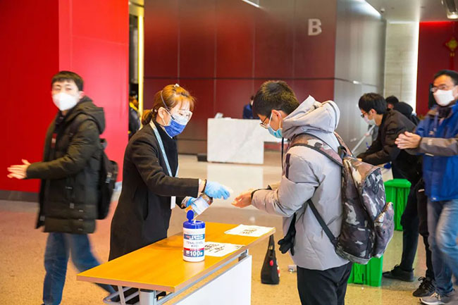 早上7点半,员工依次排队,间距相隔1米,同时准备好杭州健康码、员工卡,并由工作人员进行信息审核。在热成像仪处进行体温测量后,体温正常的员工进入消毒环节,双手消毒后可进入大楼;若热成像仪显示体温不正常,则手持测温仪再次测量,显示正常方可进入消毒。