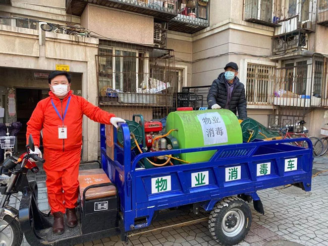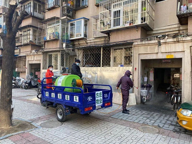 自疫情发生以来,为了有效遏制病毒,加强社区防控,首开物业所属各项目加大日常消杀力度和频次,做到消毒彻底不留死角。首开物业旗下方庄物业九分公司将日常拉杂物的三轮车和喷药雾机合为一体,自制了消毒喷洒车对小区进行集中消毒,提高效率。