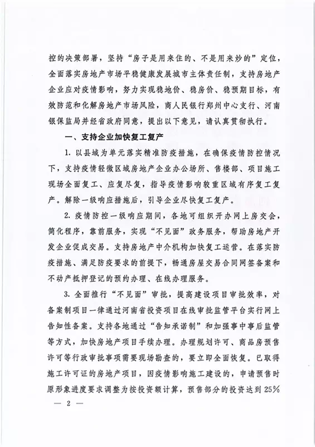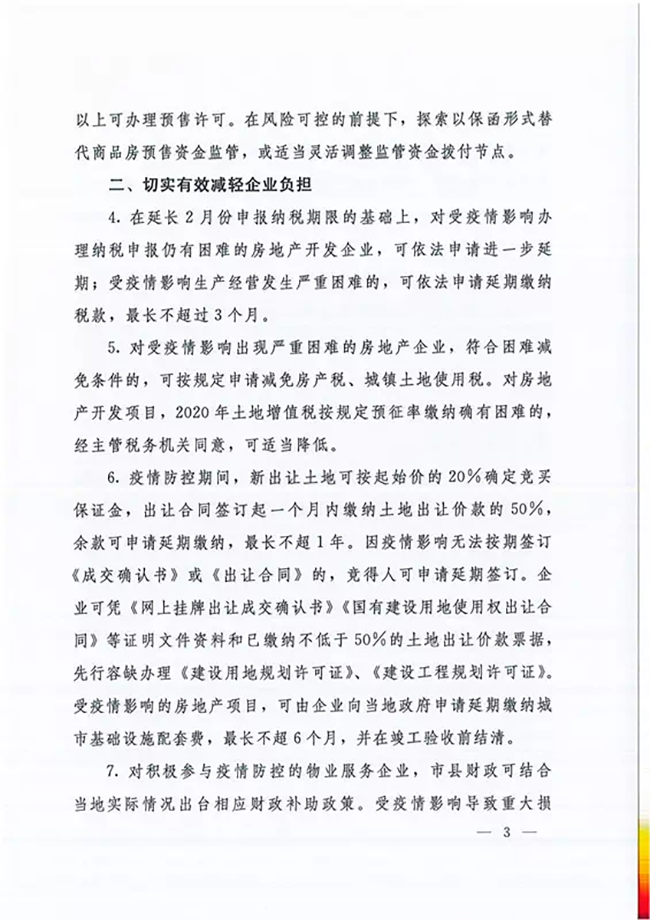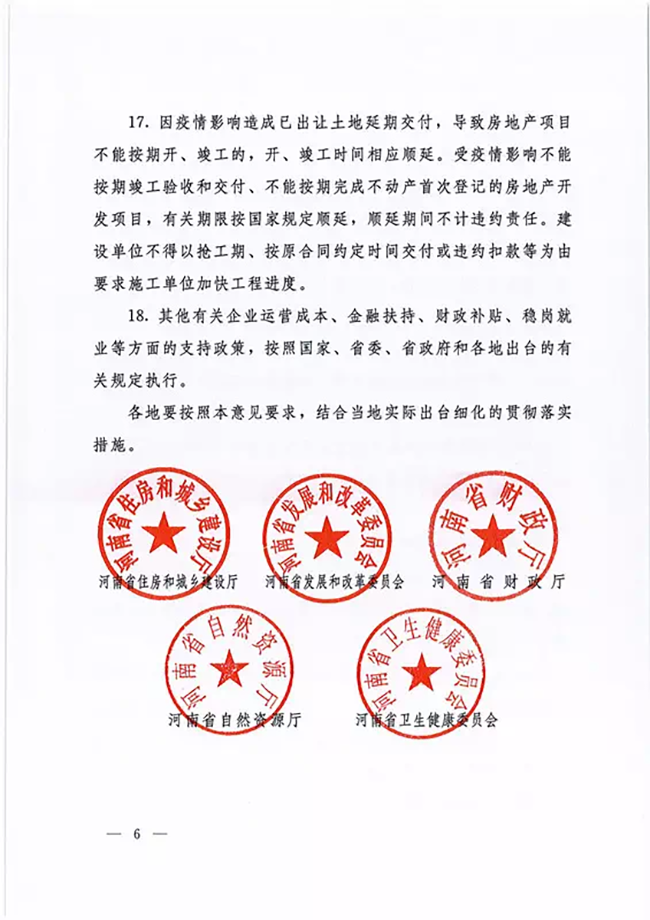 河南省七部门联合发文《关于应对新冠肺炎疫情影响防范和化解房地产市场风险的若干意见》(豫建文[2020]13号) ,在财政补贴上,明确对积极参与疫情防控的物业服务企业,各市县财政可结合当地实际情况出台相应财政补助政策。物业服务企业、住房租赁企业可按照生活性服务业享受有关支持政策。在物资保障上,明确,有关部门应统一调配辖区内房地产企业、物业服务企业所需口罩、测温计、酒精等消杀防疫物资,做好复工复产必要的疫情防控物资的保障。