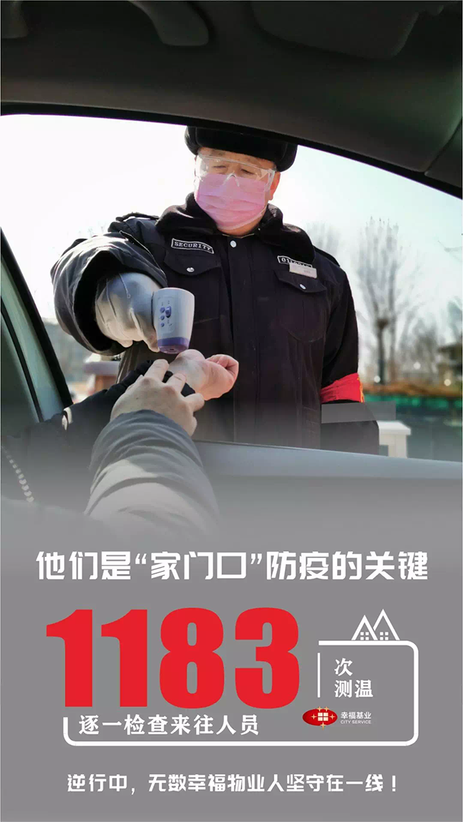 幸福基业物业实行严格的管控制度,严密把控每个住宅小区出入口,为业主保驾护航。增加人员、车辆出入检查程序,体温测量、车辆消毒率达100%;在小区门岗设立外卖和快递代收点,最大限度防止同陌生人员接触;提高对走廊、电梯、地下车库等公共区域的消毒频次,从往常的每周1次,升级为每天至少3次,同时对电梯按钮、扶手栏杆等重点区域覆盖消毒膜;此外,管家积极配合政府做好防疫宣传工作,利用朋友圈以及微信点发布疫情防控贴士。