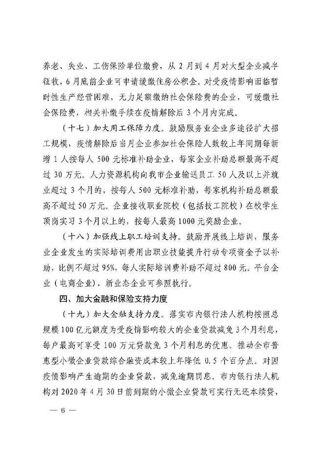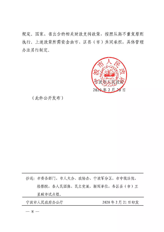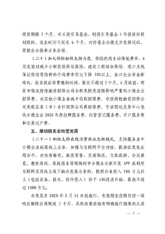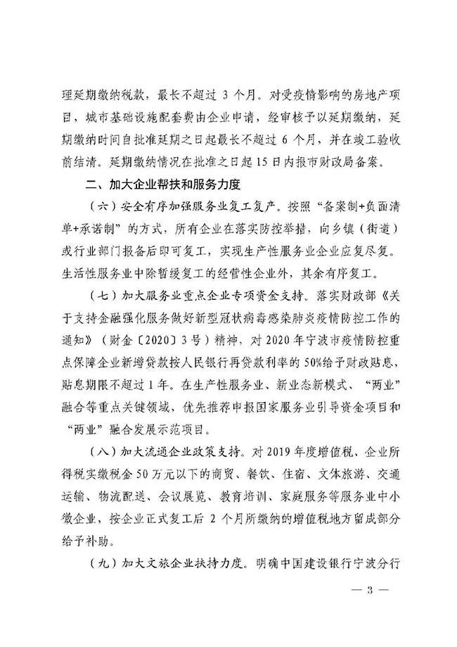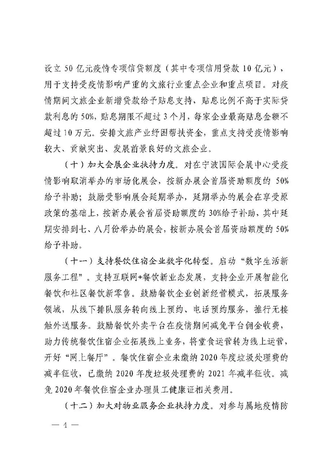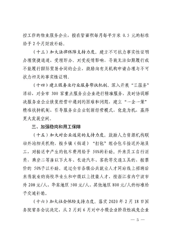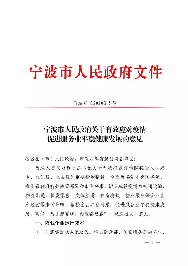2月21日,宁波市政府办公厅印发了《宁波市人民政府关于有效应对疫情促进服务业平稳健康发展的意见》(以下简称《意见》),从降低企业运行成本、加大企业帮扶和服务力度、加强稳岗和用工保障、加大金融和保险支持力度、推动服务业转型发展五个方面,出台21条意见。其中明确,加大对物业服务企业扶持力度。对参与属地疫情防控工作的物业服务企业,按在管面积每月每平方米0.5元的标准给予2个月财政补助。