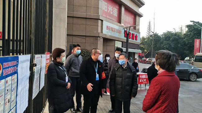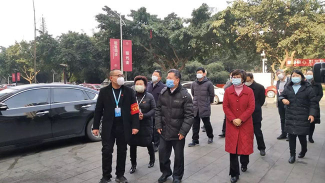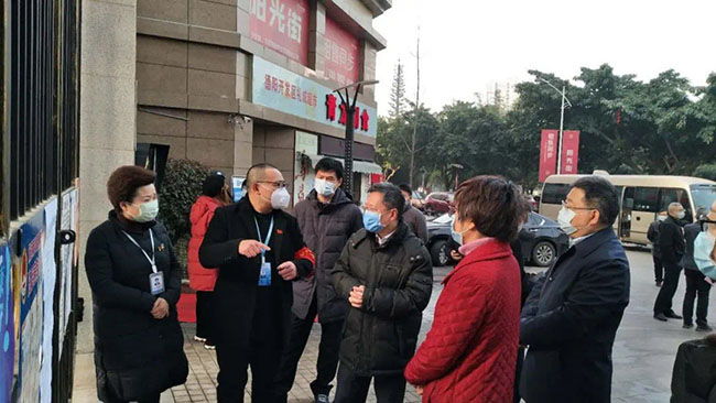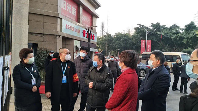 2020年2月21日上午,以国家卫健委人事司副司长徐缓为组长的国务院联防联控机制工作指导组一行来到了由金房物业集团德阳分公司提供物业服务的华庭阳光小区检查指导疫情防控工作,看望慰问奋战在疫情防控一线的物业工作人员。天津市卫计综合监督所传染病监督处副处长于信波,国家卫健委人事司劳动工资处一级调研员林长云随行。省政府办公厅副主任向晨光,省政府督查室主任蔡民,省卫健委人事教育处二级主任科员蒋金良,德阳市副市长何苹、市委副秘书长张立、市卫健委主任王宁陪同前往。