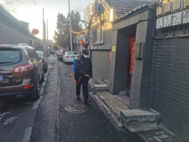 张广兵的绿化队有20多人,负责花家地北里和花家地小区的消毒工作。两个小区有225个单元门,每个单元门6层楼兼地下室约87个台阶,这就意味着每天“消杀”两遍光台阶就要迈将近4万个。从早到晚,这些绿化师傅要驼着40多斤的喷雾器,一遍遍在两个小区里“负重前行”,半天下来肩上就磨出了血痕。