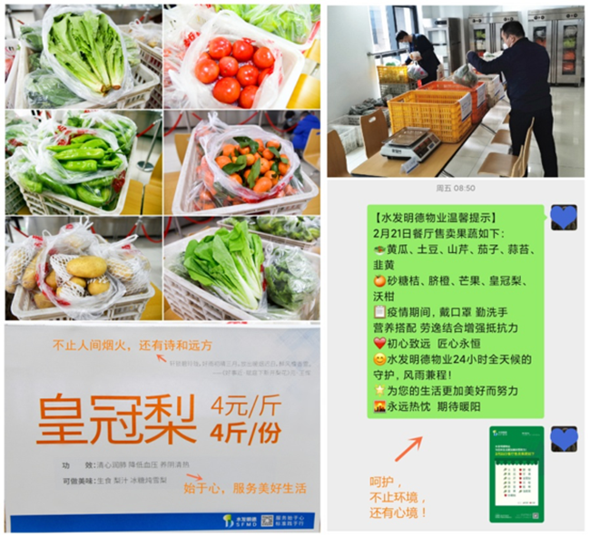 餐厅还有新鲜蔬果供大家随时选购,尽量减少返岗员工除去上班之外到超市等其他公共场所的机会。营养美味的午餐后,大家零星而来,既是散步,还要来寻找价签上的“小确幸”。那是水发明德物业人为返岗员工精心准备的紧张工作间歇的微小愉悦。呵护,不止环境,还有心境!