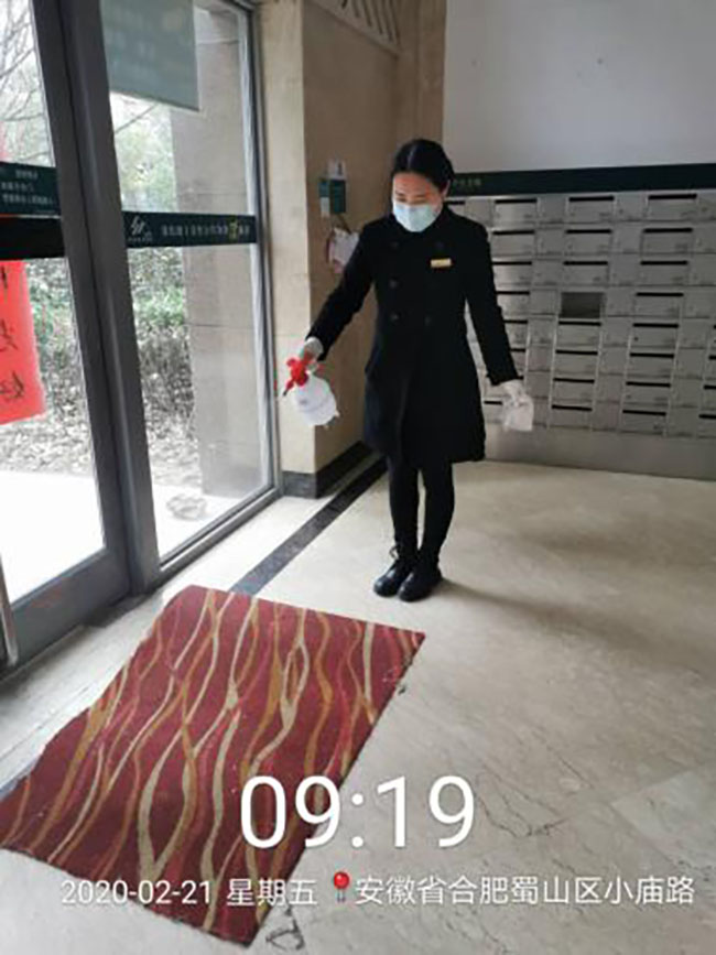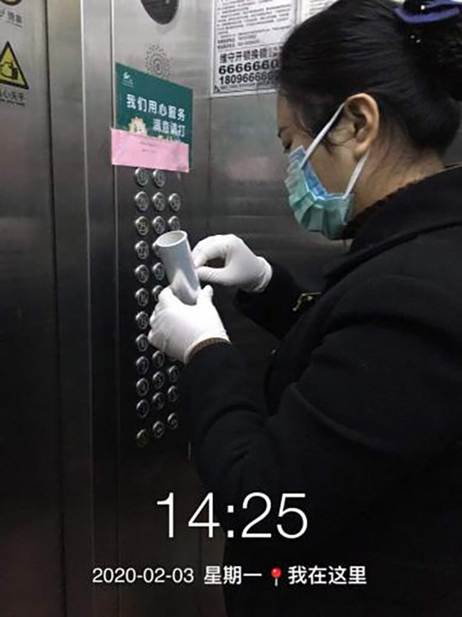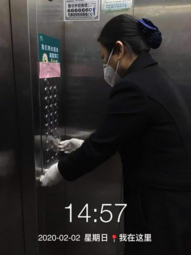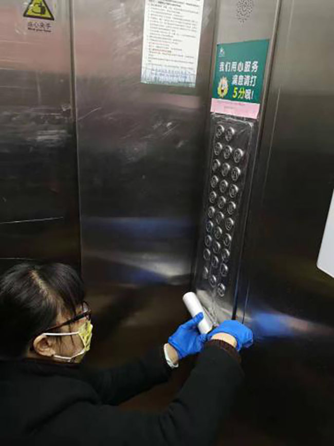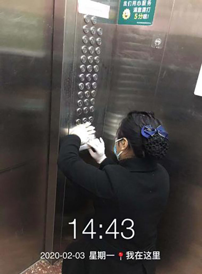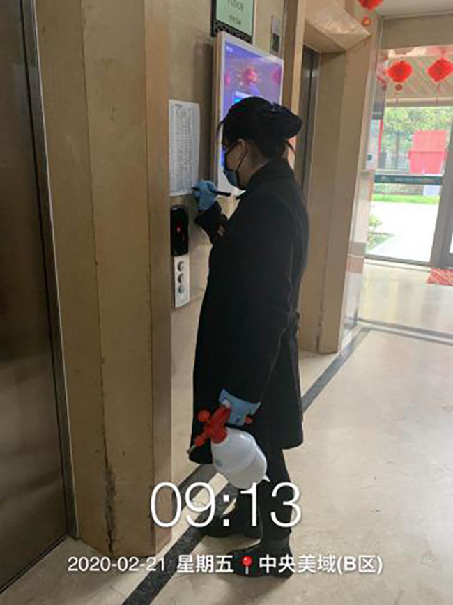 楼宇管家疫控服务篇 各楼宇管家对自己负责的楼栋电梯轿厢内、前厅、大堂门禁刷卡机每日进行消毒,确保业主放心使用。