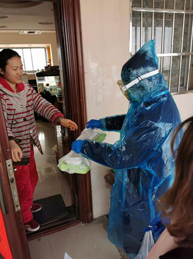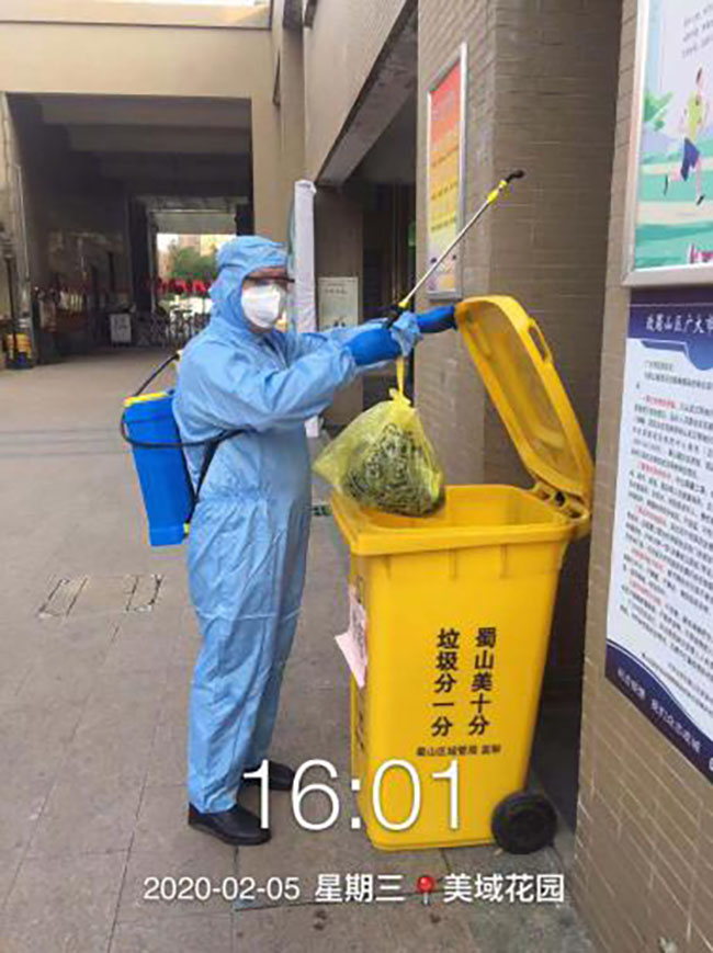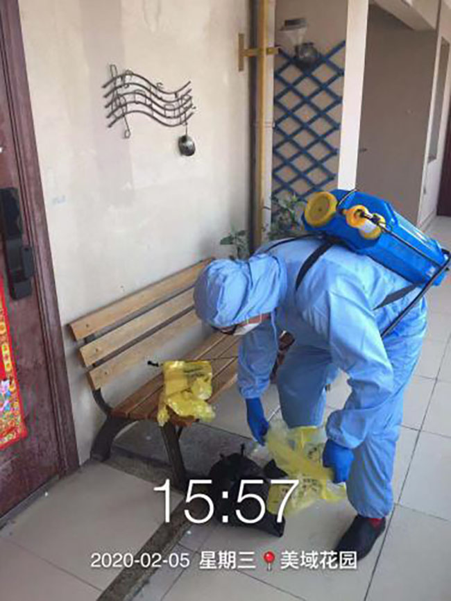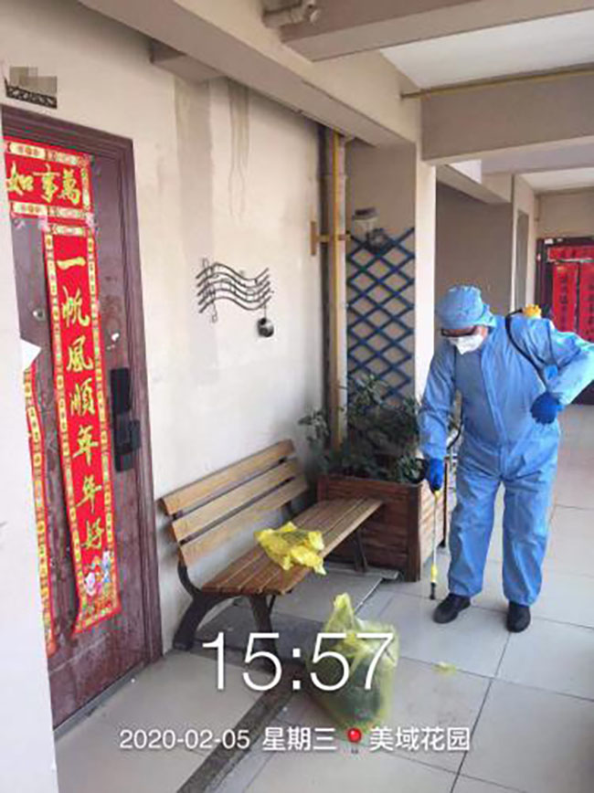 为避免增加其他同事感染风险,美域花园项目员工项伟、钟应龙主动请缨由他二人专职承担2号楼被隔离业主所需生活用品的采购送递、给该楼栋业主每日三餐送餐、垃圾处理、卫生消杀、体温检测等服务工作。
