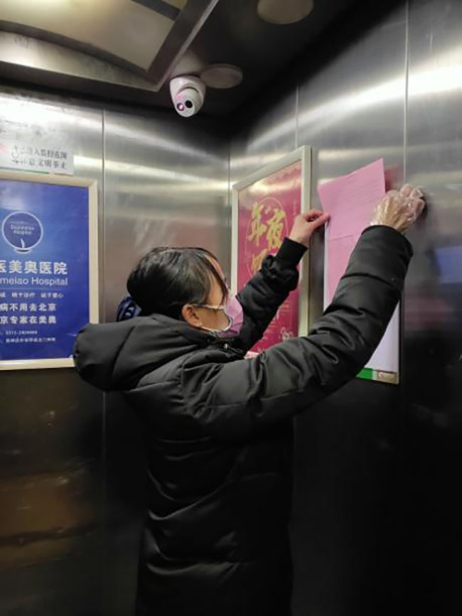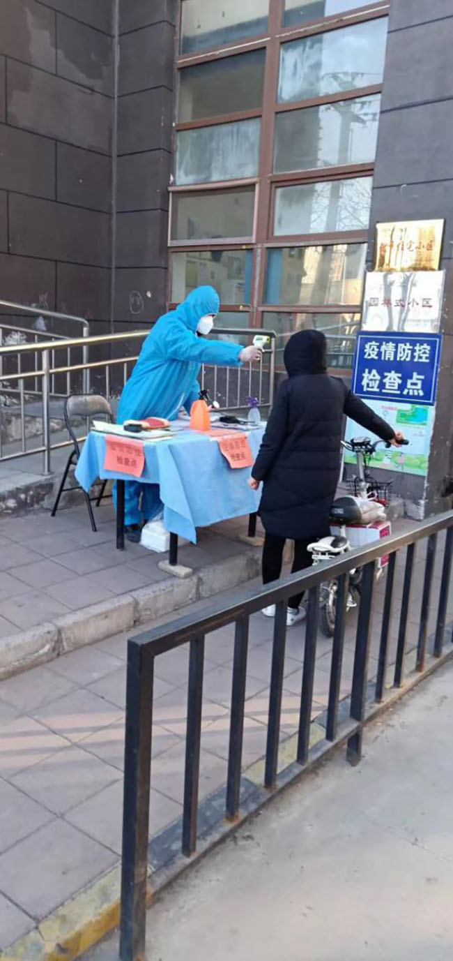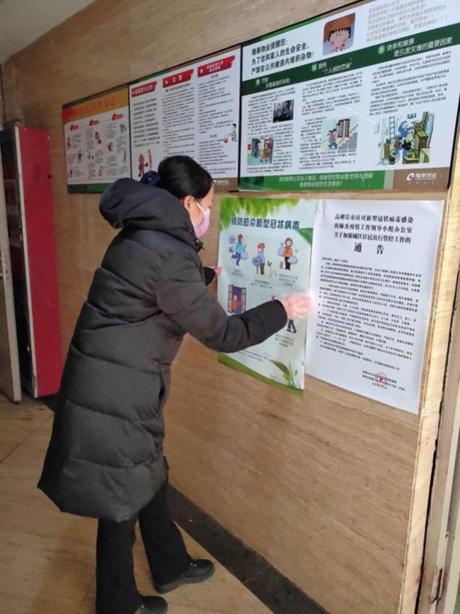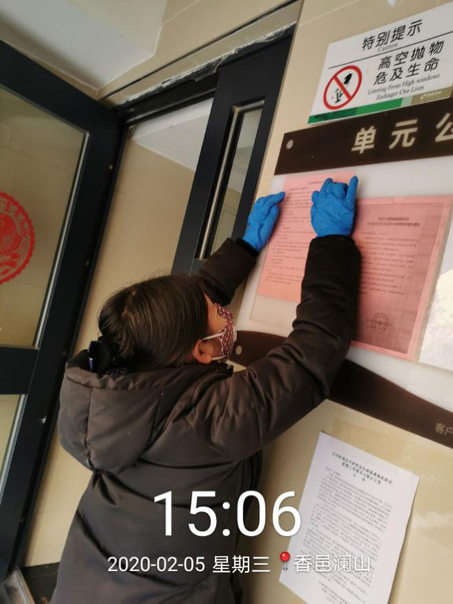 看!项目经理吕建立,平时就工作至上的她,此时更是停不下来了。从春节开始,一天都没有休息过。清晨开始开会部署工作,帮助大家做好防护,亲自到一线门岗把控进出人员,深入园区的每个角落,不放过任何一个细节……其实她也只是一个普通人,也有自己的家庭、老人、孩子,但此时此刻,只有亲临战场,看着香邑澜山的业主平安无事,她才安心。