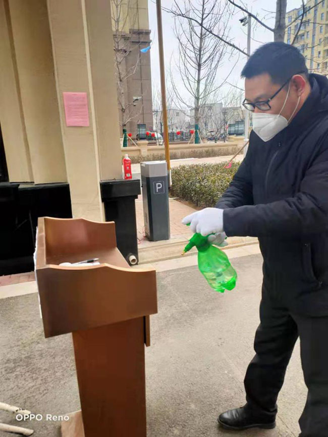 在疫情蔓延期,他牢记职责,积极响应国家号召,严格落实公司下发的各项工作要求,园区出入口、单元门口、电梯间……都有他忙碌的消杀身影。一天工作结束,他有家不能回,夜晚用薄大衣暖身,方便面暖胃,真正用行动诠释着“心暖”!