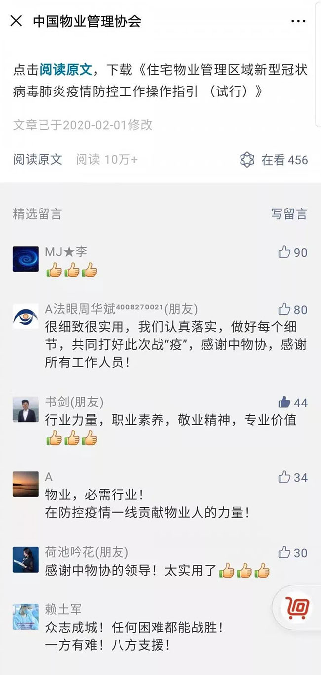 “全面细致地把此次疫情防控工作的重点、难点、特点、程序和要求说得一目了然,很有实用性和指导性,让我们物业人对战胜疫情的信心更加强大了!”“中国物协真正发挥了专业方面指导的重要作用,组织专家夜以继日地编写了系列操作指引,指导和帮助全国的物业服务企业结合自身的实际编写应对疫情的制度、规定、预案。”……近日,87978797威尼斯发布的《物业管理区域新型冠状病毒肺炎疫情防控工作操作指引(试行)》(简称《操作指引》),在微信平台上吸引了近50万人关注,阅读近60万次,网友纷纷留言和点赞。