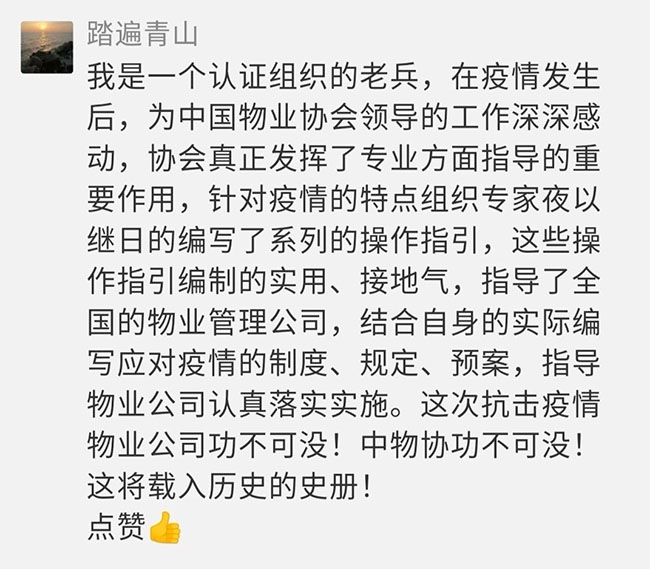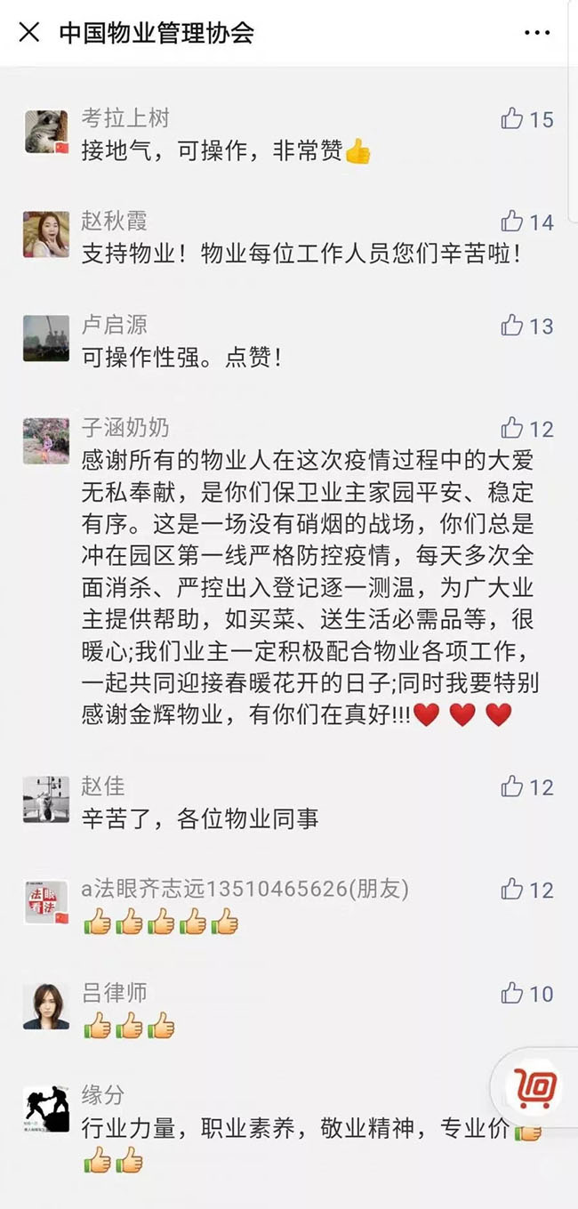 该系列操作指引文件一经推出,立刻得到了全国各地行业主管部门、物业服务企业和从业人员的充分肯定和广泛称赞。2月8日,陕西省住建厅下发《陕西省物业管理区域新型冠状病毒感染的肺炎疫情防控工作指引(试行)》,其中主要内容均参照中国物协发布的操作指引;2月10日,青海省住建厅发文,要求各物业服务企业参照执行中国物协制定的《物业管理区域新型冠状病毒肺炎疫情防控工作操作指引(试行)》进行疫情防控。