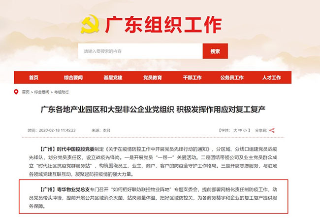 粤华物业发挥党组织战斗堡垒作用和党员先锋模范作用,团结带领全体员工坚守岗位,做好复工防疫保障工作被“学习强国”、“广东组织工作”、广州电视台等多家媒体报道。